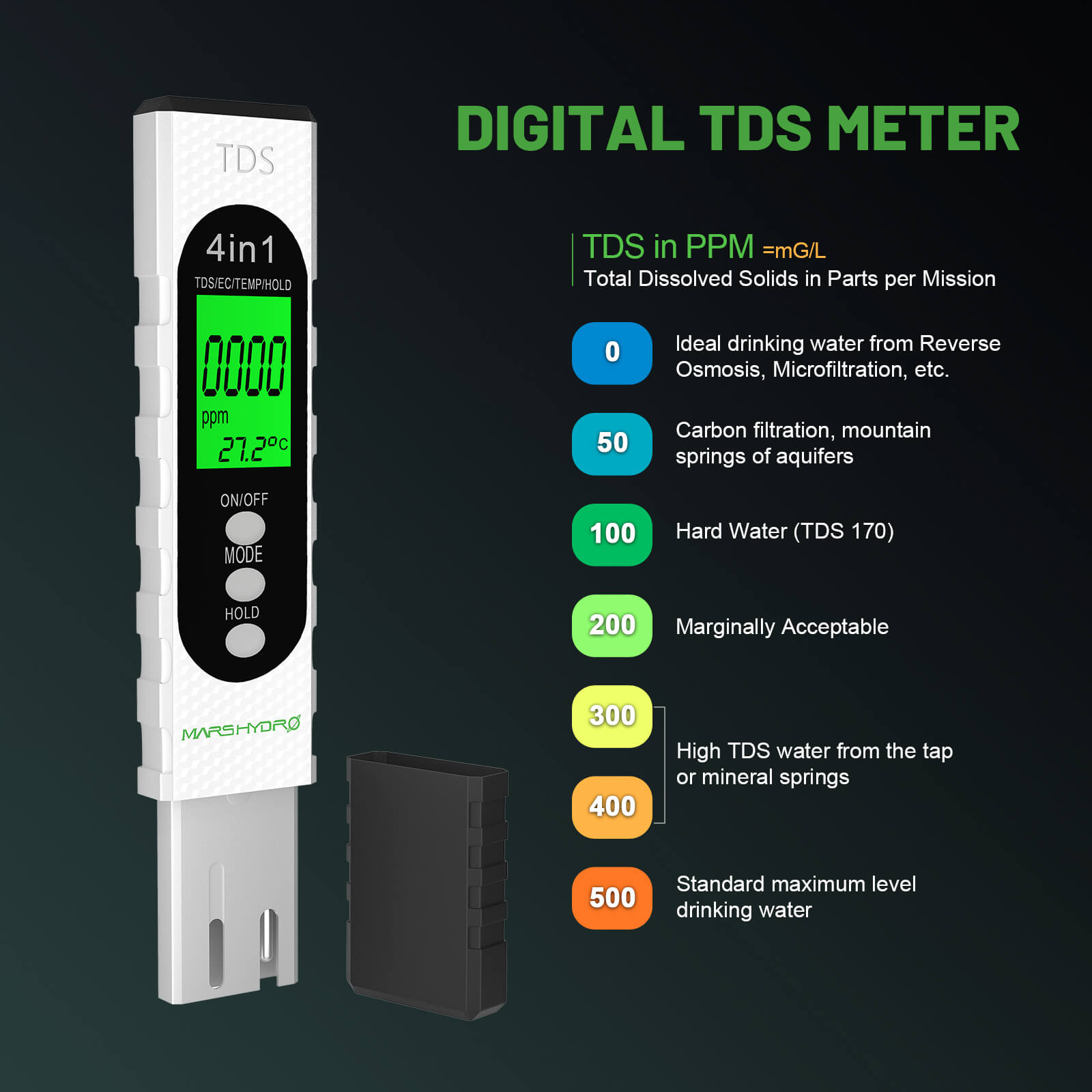 Provide Accurate Data: Mars Hydro TDS meter can switch between four display modes (TDS+Celsius, EC+Celsius, TDS+Fahrenheit, EC+Fahrenheit), making it easy to access the exact data growers need. The combo also includes three pH calibration buffers and a user manual with detailed instructions on how to calibrate the pH meter when necessary.